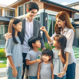 DALL·E 2024-05-22 16.47.15 – An image of a happy family consisting of two parents and two children receiving house keys from a real estate agent. They are standing outside a new h